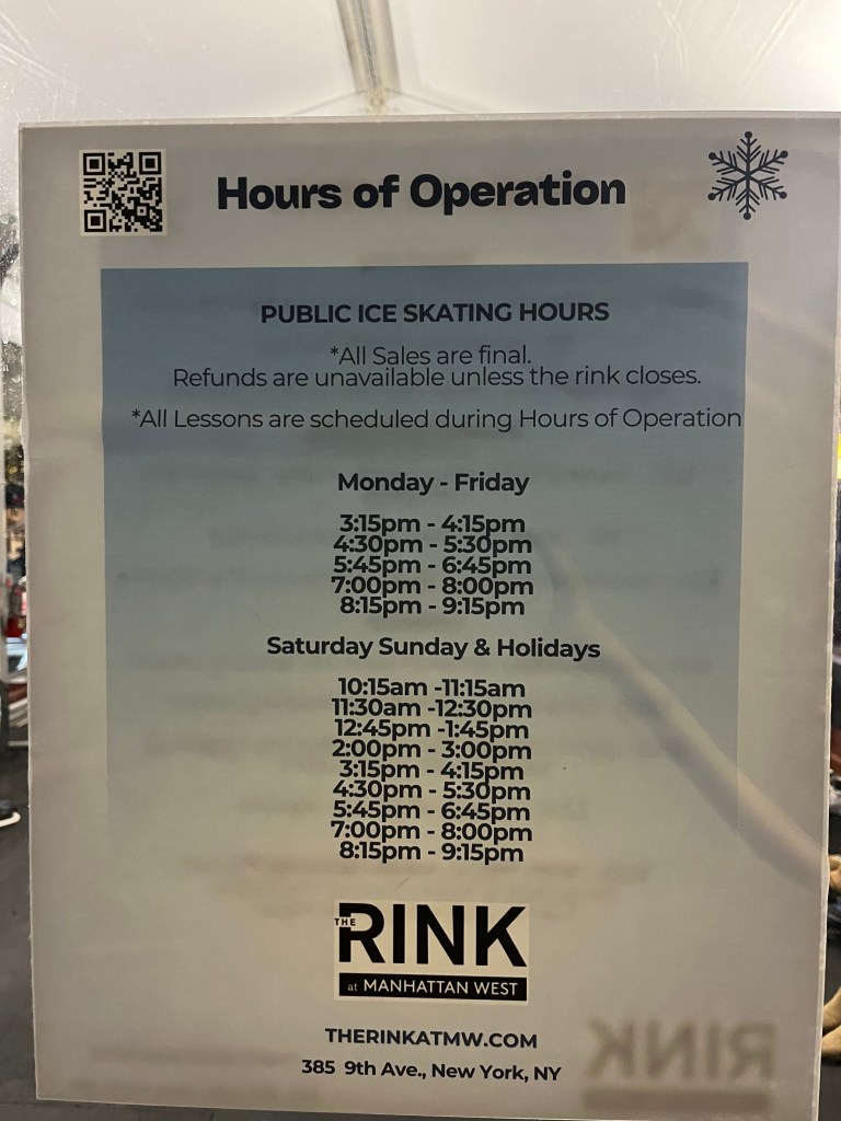 Pista de Hielo Roebling rink. Situada en Brooklyn bridge park. Su web: https://www.roeblingrink.com/ . Tiene diferentes horarios en función de los días, mejor ver su web y elegir.