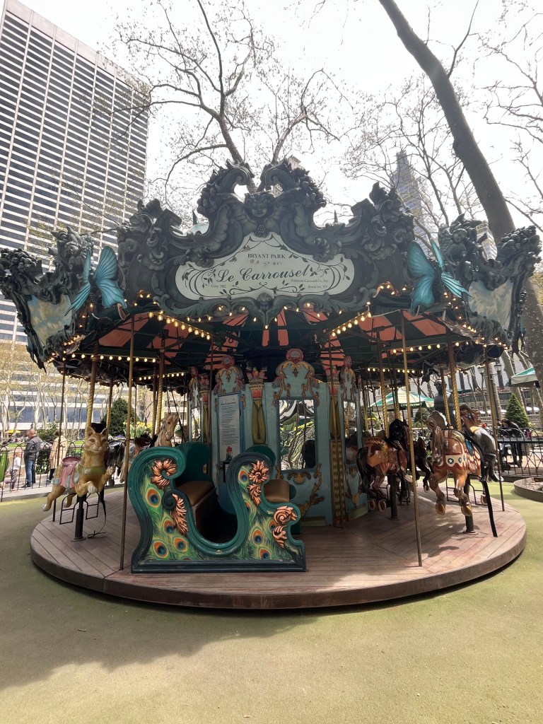 - Carrousel Bryant Park: Otra vez este céntrico parque nos ofrece una nueva atracción, ya os hablamos de la pista de hielo en otro apartado, os dejamos el enlace a su web, donde podéis ver los precios y horarios en función de la temporada del año. https://bryantpark.org/calendar/event/le-carrousel